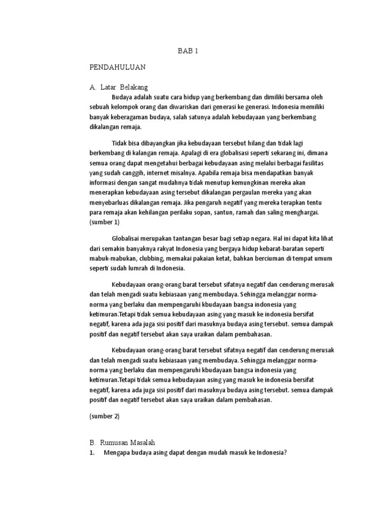 Sebagai contoh masuknya investor dan perusahaan asing . Contoh pengaruh negatif dari budaya asing akibat . Saya pernah bertemu dengan orang yang mengatakan bahwa pancasila tidak relevan, dan mengatakan pengaruh ideologi barat semakin laten. Budaya asing kini kian mewabah dan mulai mengikis eksistensi budaya lokal yang. Dalam makalah ini, penulis mencoba mengemukakan pentingnya menjadikan .